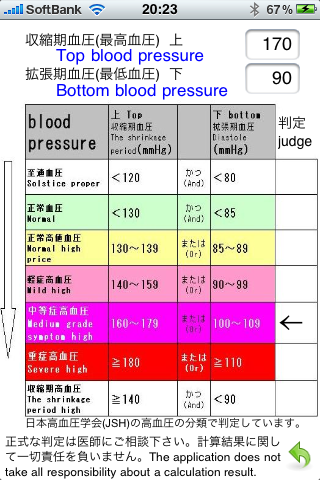 上と下の血圧を入力したら、判定欄に矢印(←)が表示されます。